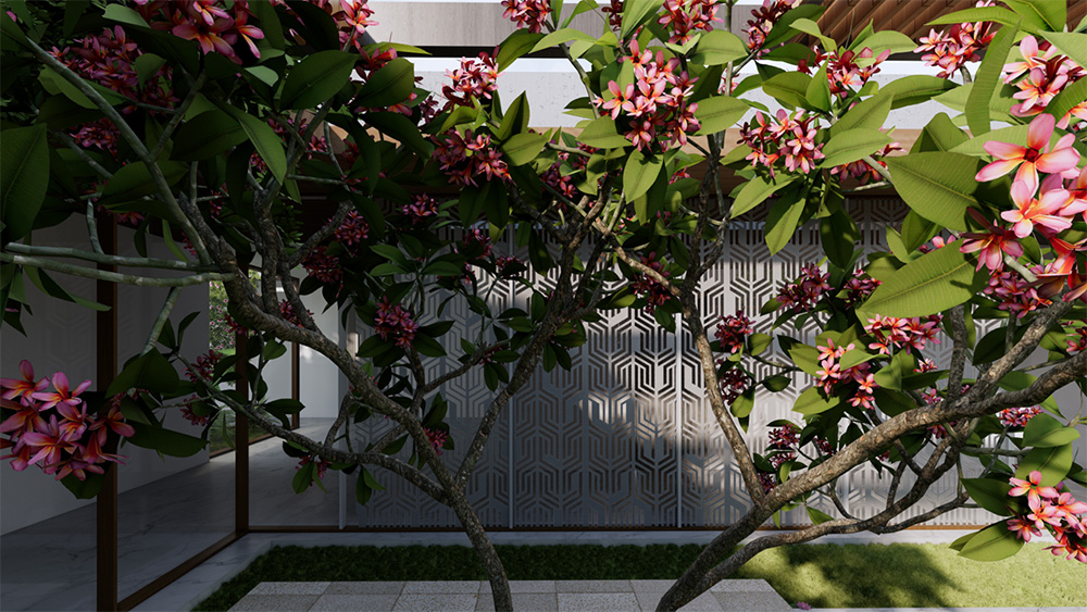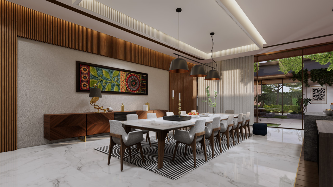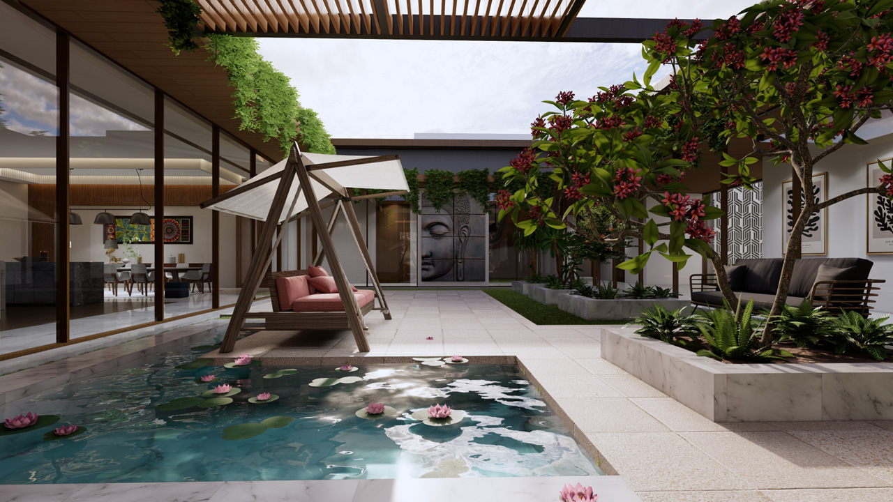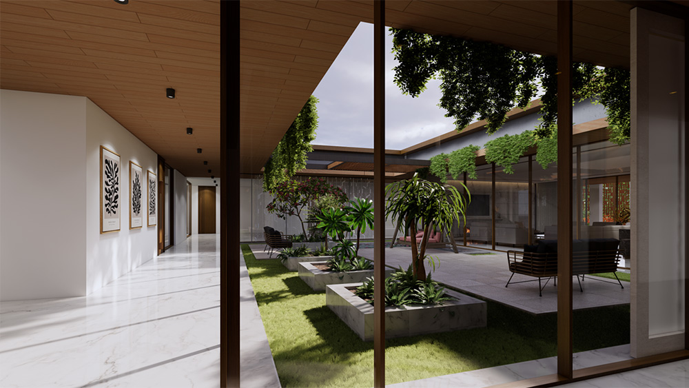 For this serene one-story residence designed on single floor Vastu played integral role in the design layouts , featuring a central Central courtyard the Brahmasthana which functions as the heart of the house or calm focal point that let in fresh air and natural light with everybody joining by default for early morning yoga, winter afternoon lunch or evening family chats.