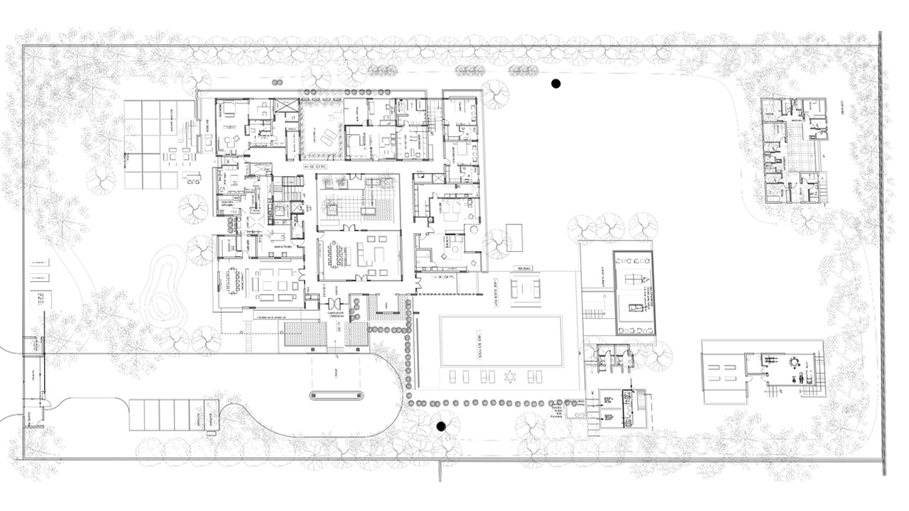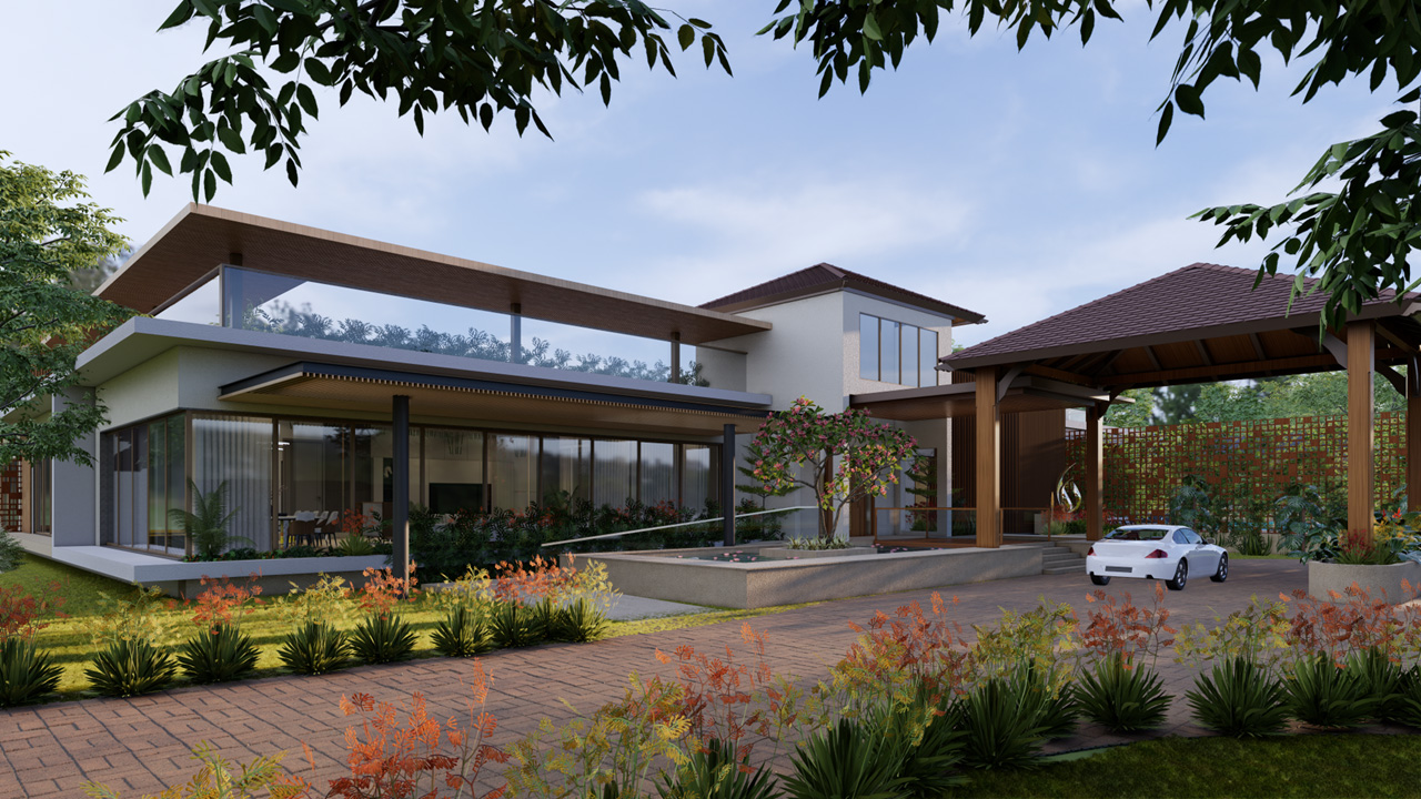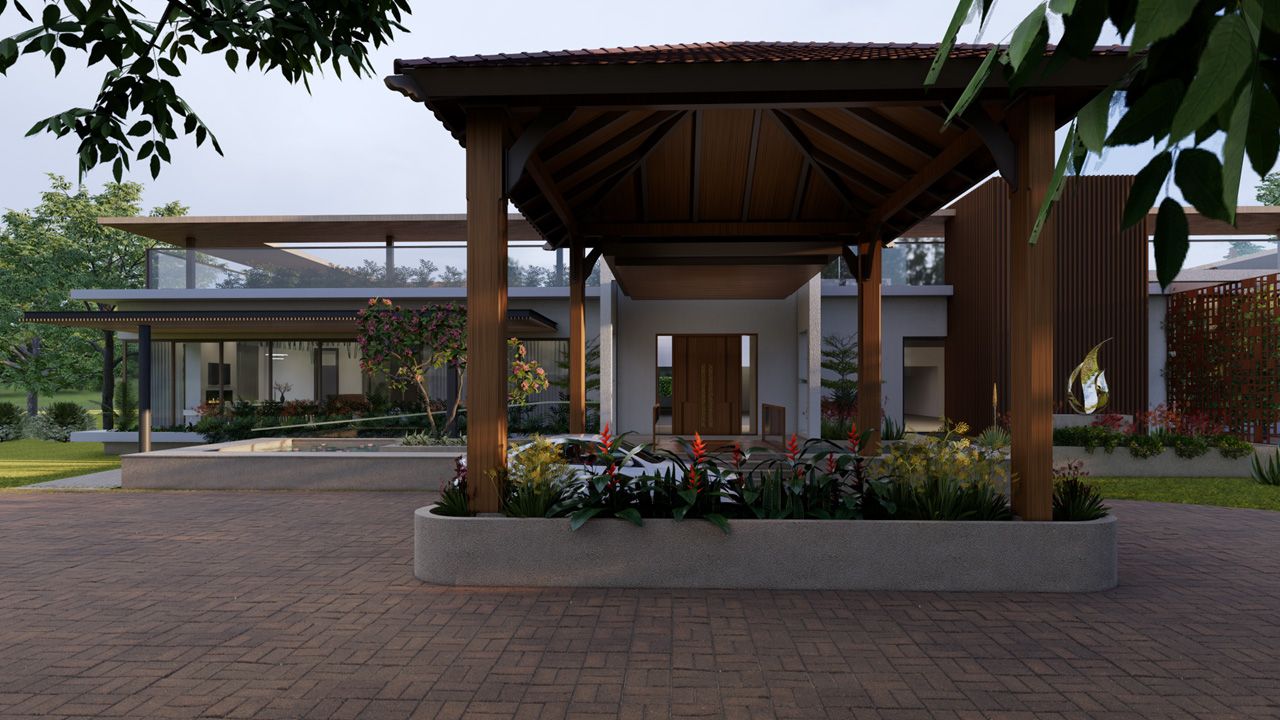 The built structures, to include main house, multi function block, Office area, SPA and servant blocks adds to nearly 20,000 sq. ft., is distributed strategically on the plot confirming to Vastu principles of design. A swimming pool area with separate access doubles up as a party space strategically placed near entrance for guest entry close to multifunction hall, in the lawns enhances the overall utility of the space. Every room offers views both outward and inward toward the courtyards and surrounding landscape.
