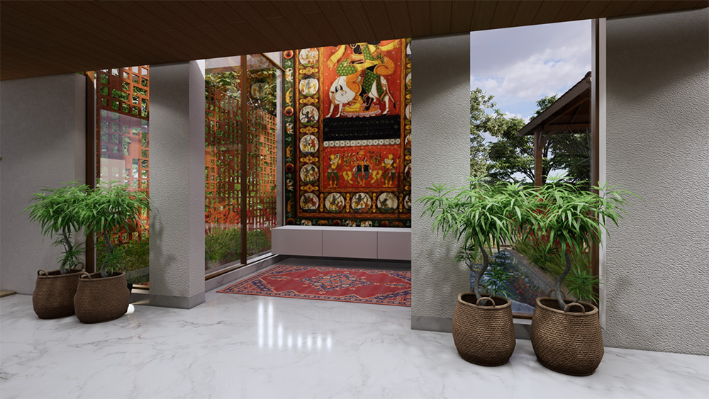 The corridor and verandah ceilings are strategically lined with wood, creating a warm ambiance, the porch is adorned with Mangalore tiles, adding a traditional touch to the space,